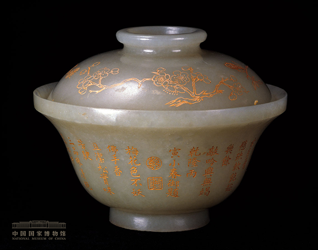 玉为青色,带盖。碗腹部竖刻清乾隆皇帝御题诗一首,阴刻填金。此器原为清宫旧藏。