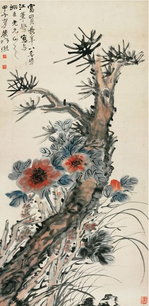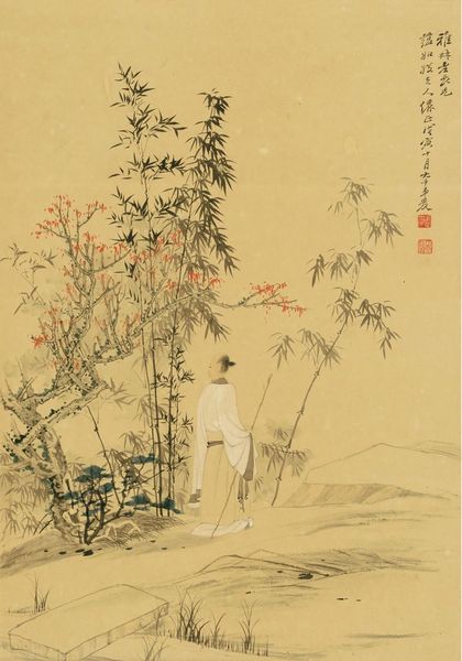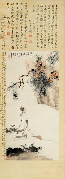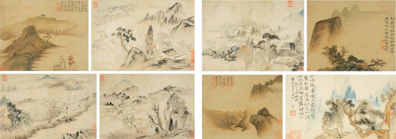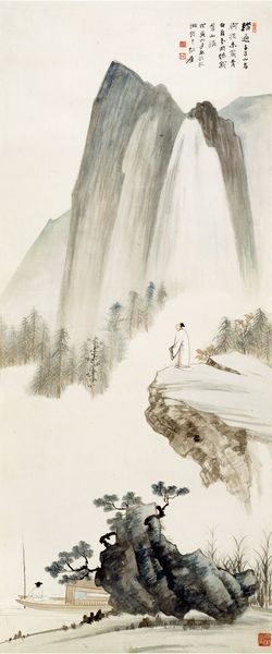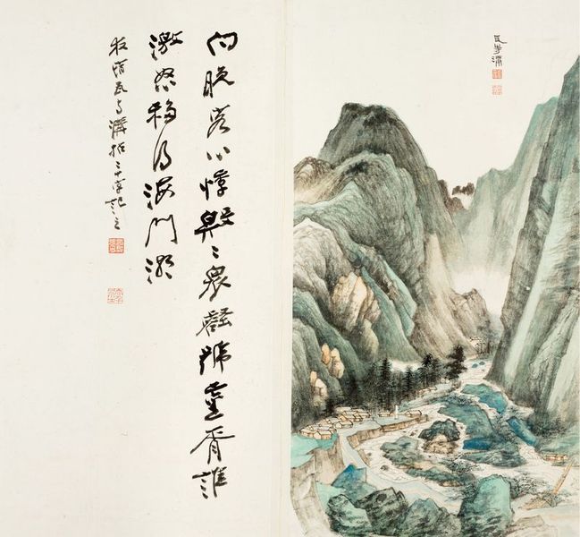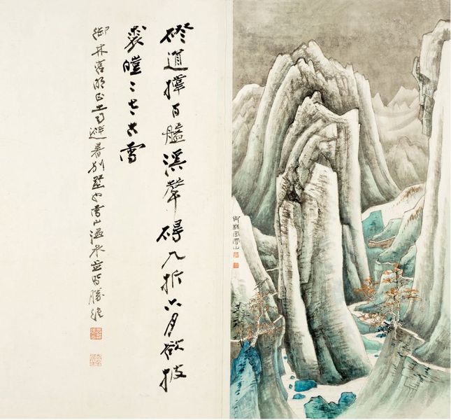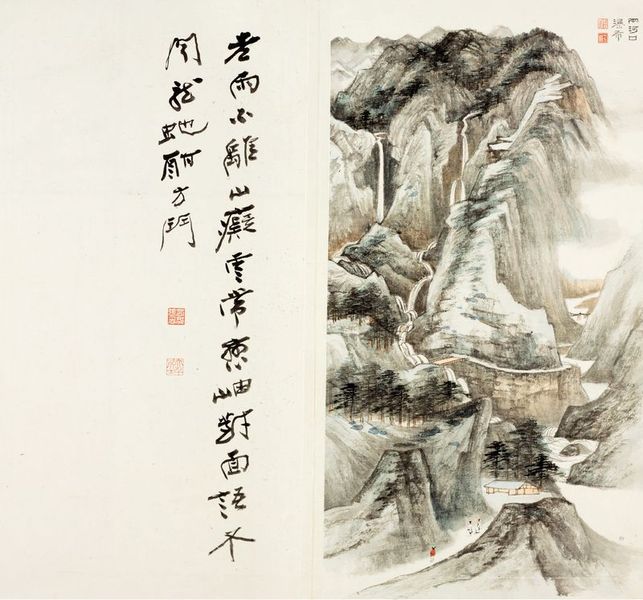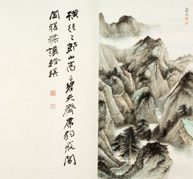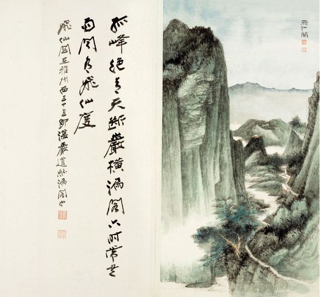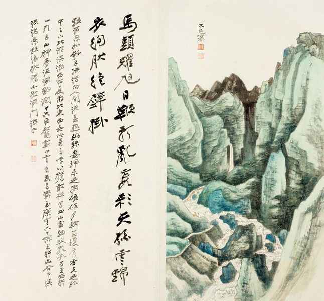 1919年张大千拜曾熙、李瑞清为师,学习诗文、书画。二人同时也是著名的鉴赏家,并与上海著名收藏家狄平子、庞莱臣等人交往颇深,加之张大千本人亦热衷收藏书画名迹,因此他得以开阔眼界,长期近距离领会古代绘画中的奥妙。其早期作品以模仿石涛为门径,遍学王蒙、盛懋、吴镇、唐寅、仇英、徐渭、陈淳、陈洪绶、董其昌、弘仁、髡残、八大山人、梅清、任伯年等人。在追摹前人作品时,真正做到了学古、融古、化古,所作“临仿作品”许多都与原作难分真赝,足见他对古人作品的观察之细、领会之深。 20世纪40年代之后,在山水画方面,张大千以学习元代王蒙为门径,继而开始追慕五代董源、巨然的画风。以体悟黄山、华山、雁荡山、峨眉山、青城山之自然变化为楔入点,以高远、平远的图式和独特的笔墨技法为手段,形成了一种崭新的、充满古意的山水画风格。在花鸟画中,他一方面追求宋代院体富丽金碧的风格,一方面也多作大写意泼墨荷花和“没骨”花卉。在人物、走兽作品中则兼取敦煌艺术与五代两宋绘画特点,以极富力量感的线条和惊艳的色彩塑造形象,与之前清新简淡的风格相比产生了很大变化。 张大千从文人绘画、宫廷绘画、宗教绘画甚至民间绘画中汲取营养广收博览,加之其个人的艺术领悟力和创造力,使得作品能够集古人之大成,并有所创新。因此到了20世纪60年代左右,张大千才能够开创出以泼墨、泼彩技法为特征的崭新画风。 |