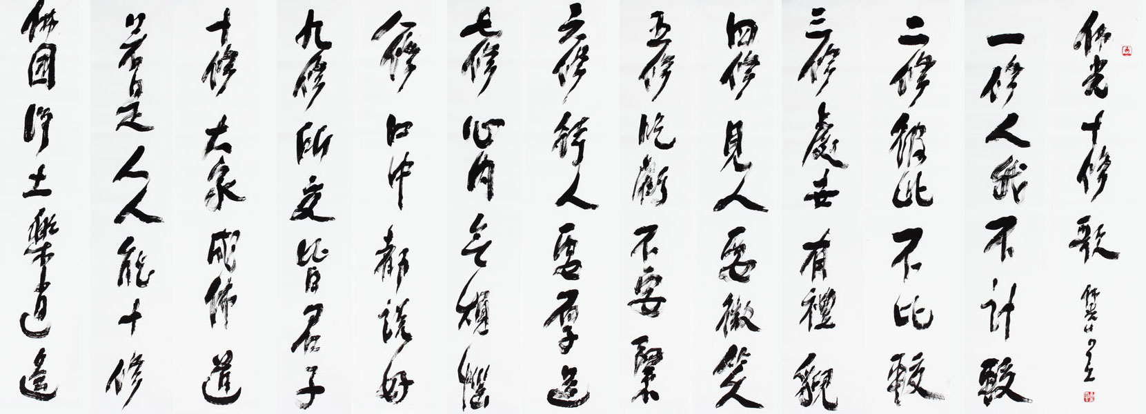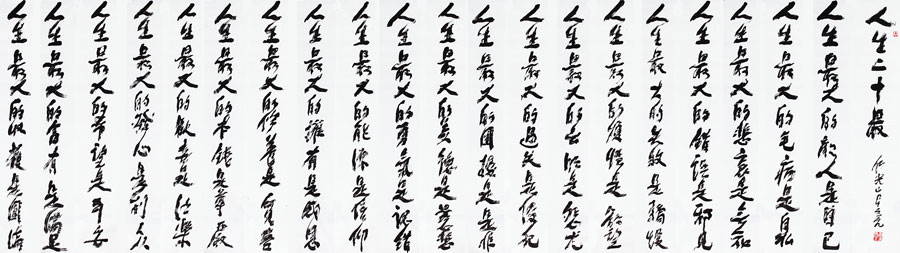 大师从写二个字的“行佛”、“禅心”,慢慢的写到三个字、四个字的座右铭,例如:“我是佛”、“法同舍”,到“悲智双运”、“生忍法忍”、“从善如流”等;甚至于从四个字逐渐增加到六个字的“无上正等正觉”,八个字的“道无古今悟在当下”。乃至大师也自我挑战写起对联来。好比他得意的:“海纳百川流不尽,空容万象是吾家”、“千江有水千江月,万里无云万里天”,现在更写出长句如“陋室铭”、 “人生二十最” 等。