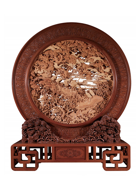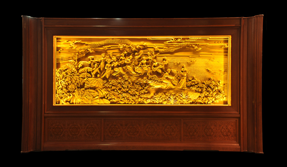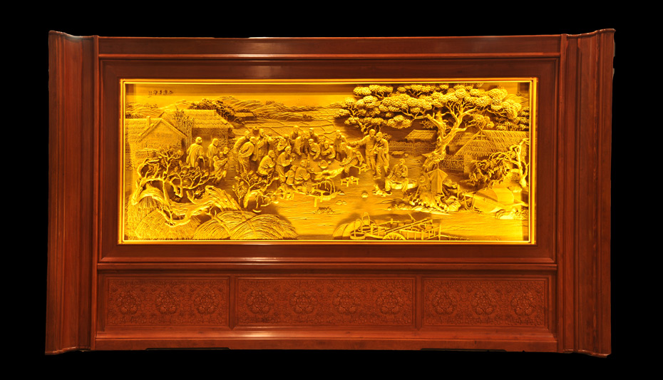 2017年正值陆光正先生从艺60年之际,“丝路华章——陆光正从艺60年东阳木雕大展”在中国国家博物馆举办,展览以“中国梦”为序篇,以“丝路记忆”为上篇,“复兴路上”为下篇,展示陆光正先生为弘扬丝路精神,宣传“一带一路”的伟大意义而创作的木雕作品。序篇由多件三层次综合成一件作品,反映中华民族励精图治、奋发图强,实现“中国梦”的时代风貌;“丝路记忆”重点呈现陆上丝绸之路与海上丝绸之路的历史画卷,以鲜活的历史人物及丰满的背景信息体现了丝路的艰辛开辟、曲折前行,更体现了贯穿其中、绵延至今的丝路精神;“复兴路上”则是对“一带一路”沿线国家的生态、经济、文化、科技等方面的描绘,展现了借助新技术、运用新资源进行创新开发的成果。本次展览的作品皆以东阳木雕的经典手法进行创作,浅浮雕、深浮雕、镂空雕、圆雕、半圆雕等雕刻手法综合运用,展现了东阳木雕丰富多彩的雕刻技艺;与此同时又将多样造型手法结合在一起,使作品的造型更为生动、空间层次更为丰富,充分反映出东阳木雕的表现能力与技艺水平。陆光正先生用雕刻刀描绘了“一带一路”这一中华民族伟大复兴上的重要进程,同时也展示了他精湛的木雕技艺和独具的艺术创新能力。