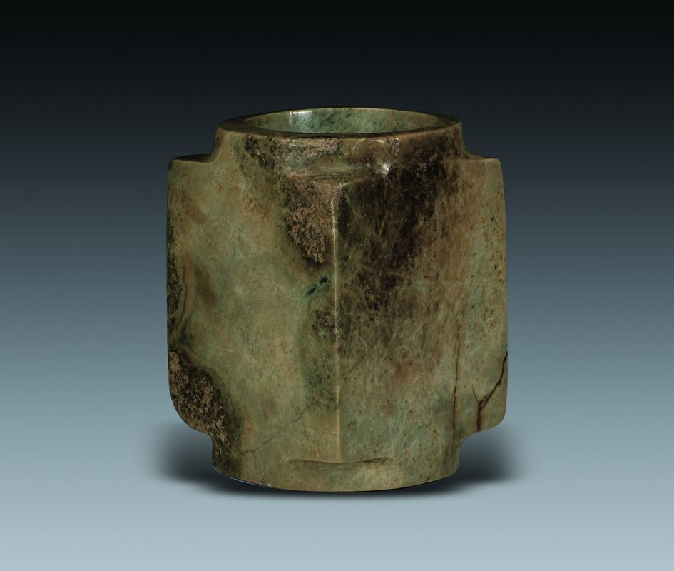 器呈青灰色,上有褐色沁纹。器外方内圆,上、下射部为矮圆柱体,中间为方柱体,中心从上至下有一大圆穿孔,外壁光素无纹。