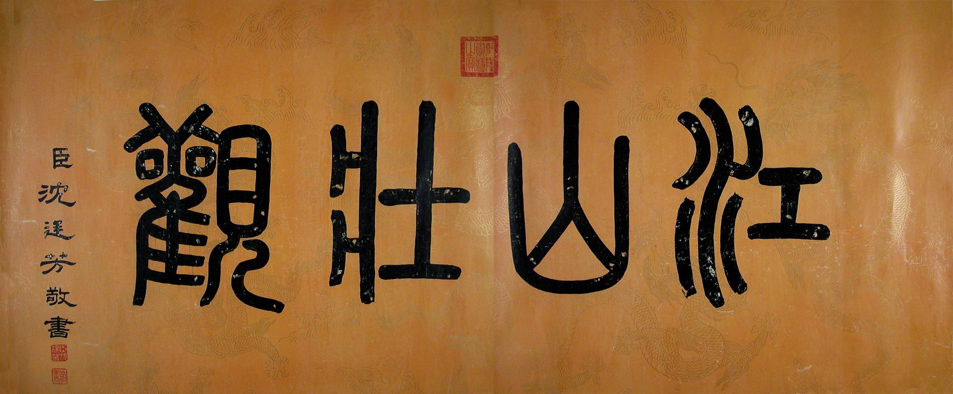 此图纸本设色。首题“江山壮观”,下署“臣沈廷芳敬书”,上钤“乾隆御览之宝”。后记由汉满两种文字写成,下署“乾隆十七年四月十六日臣王安国敬书”,钤有“八徵耄念之宝”。《后记》云:“我皇帝御极以来,励精无逸,复省方南来,亲问民间疾苦,山川郡国利弊,讲求尤备。而侍从之臣唐岱等于各府县山川形势、城池关隘、津梁堤堰、陵墓观寺、舟车所历,藉得亲尝,谨参图经所载”,绘成此图。《后记》叙述京杭运河所经各地:运河自杭州东北经嘉兴府至苏州府,又西北至瓜州口入江(长江);由江而北与扬州漕河汇,经高邮州、宝应县,又北经淮安府西折而入淮水,又北出以入于河(黄河);又西北经清河县、桃源县、宿迁县、邳州城、睢宁县、灵璧县,又西北经徐州而接于泉河;又西北经沛县、鱼台县、济宁州、汶上县、东平州、寿张县、东阿县、阳谷县、东昌府、堂邑县、博平及清平县,北经临清州城西而入于卫河;又北经夏津县、武城县、恩县、故城县,经德州城西、景州、吴桥县、东光县、交河县、南皮县、沧州城、静海县,至天津而合于白河;又西北经武清县而至通州与北运河汇,乃达于都城。