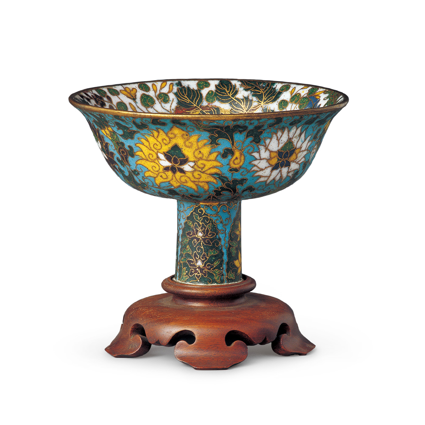 这件珐琅器,撇口高足,配木制底座,碗内为白色地,饰以鱼藻纹,碗外为天蓝地,饰番莲纹。掐丝珐琅器,是在金属胎体上,用细铜丝铆焊成图案,加填各种珐琅彩釉料,经高温成色,最后磨光成器。这种工艺品的制作技术,在明代景泰年间(公元1450~1456年)日臻完善,成品多以蓝色为地,色泽晶莹,又被称为“景泰蓝”。
