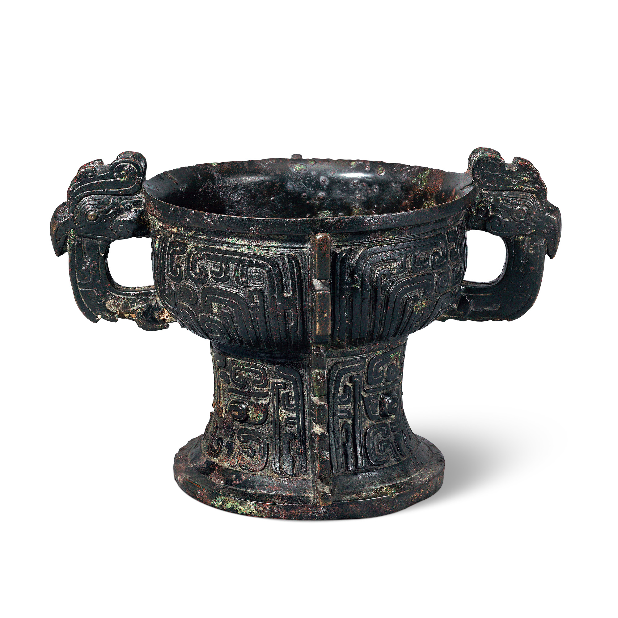 此器又名六年琱生簋。圆口,沿外折,腹微鼓,下有喇叭形高圈足。腹两侧有鸟形双耳。器身前后饰大扉棱两道,通体以云雷纹填地,饰变形饕餮纹。簋通体黝黑,造型美观大方,给人以富丽堂皇之感。