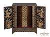此柜设计巧妙,纹饰精美。制作者加大了其深度和宽度,而未增加其高度,以方便取用药材;全柜黑漆地,正面及两侧饰描金双云龙纹,背面及门内饰描金花、蝴蝶纹。柜背面有金泥书写“大明万历年制”款,为宫廷御药房所用,是明代宫廷家具制造中的精品。