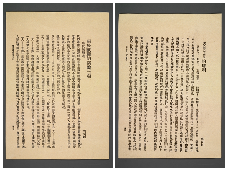 李大钊是中国第一个传播马克思主义并主张向俄国十月革命学习的先进分子。1918年11月,李大钊在《新青年》第五卷第五号上发表《庶民的胜利》和《Bolshevism的胜利》(即布尔什维主义的胜利)两篇文章,热烈地赞扬十月革命,指出无产阶级的社会主义革命是世界历史的潮流。什么皇帝、贵族、军阀、官僚、军国主义、资本主义,“遇见这种不可当的潮流,都像枯黄的树叶遇见凛冽的秋风一般,一个一个的飞落在地”。他满怀信心地预言:“试看将来的环球,必是赤旗的世界!”