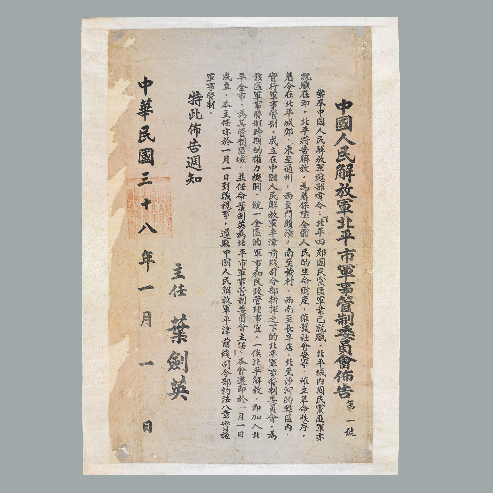 1948年11月29日,东北、华北人民解放军平津战役,将国民党军队在华北战场的主力分割包围在北平、天津、张家口、塘沽、新保安等战略据点。12月中旬,中共中央决定建立中共北平市委和北平市军事管制委员会,为接管北平做好准备工作。1949年1月1日,根据中国人民解放军总部的命令,在北平郊区良乡成立了中国人民解放军北平市军事管制委员会,叶剑英为主任。