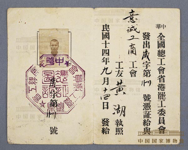 1925年6月,香港、广州工人为声援五卅运动发动声势浩大的省港大罢工。19日,香港工人首先举行大罢工。21日,广州工人举行总罢工。至6月底,共有25万人参加。为加强统一领导,在中国共产党和中华全国总工会领导下,成立了由苏兆征、邓中夏等为领导的省港罢工委员会,并在广东革命政府资助下组织纠察队,封锁香港。罢工坚持16个月,从政治、经济上沉重地打击了英帝国主义势力。这是罢工委员会发给广州意诚工商工会工友黄湖的罢工工人凭证,凭此证可享受规定的领取饭券等权利。1959年4月广州中华全国总工会旧址纪念馆拨交。