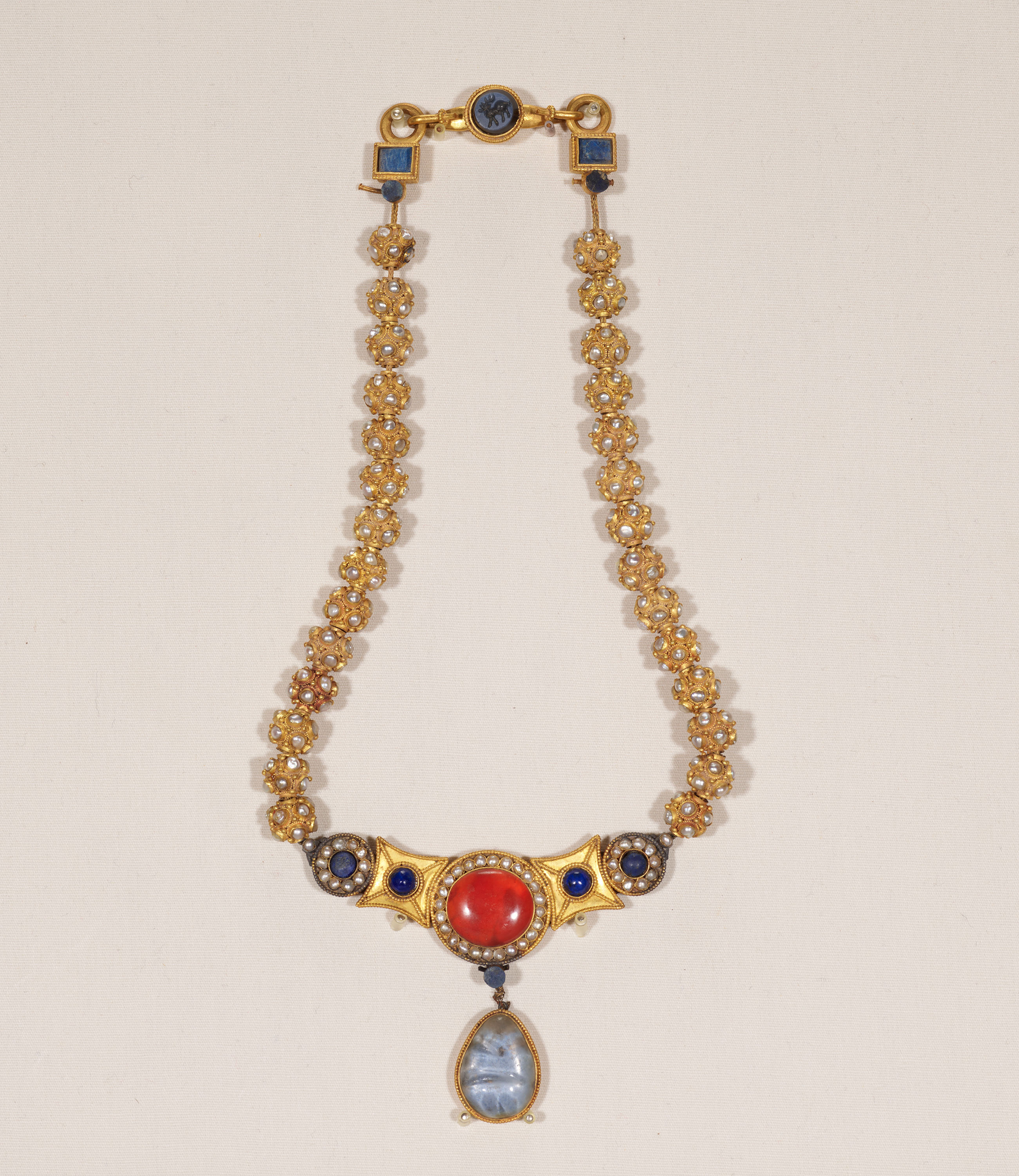 这条金项链由二十八个金质球形链珠组成,每个球形链珠均由十二个小金环焊接而成,其上又各嵌珍珠十颗,珠光闪闪,璀璨夺目。项链上端正中为圆形,内嵌凹刻一花角鹿的深蓝色垂珠。项链下端居中为一个大圆金饰,上镶嵌一红色宝石,宝石四周嵌有二十四颗珍珠,左右两侧各有一圆形金饰,上镶嵌蓝色珠饰,周缘亦各镶嵌珍珠一周。宝石下挂一心形金饰,上镶嵌一块长达3.1厘米的蓝色宝石。整条项链红、蓝色宝石交相辉映,再配以洁白的珍珠,在纯金的烘托下格外鲜艳夺目,雍容华贵。