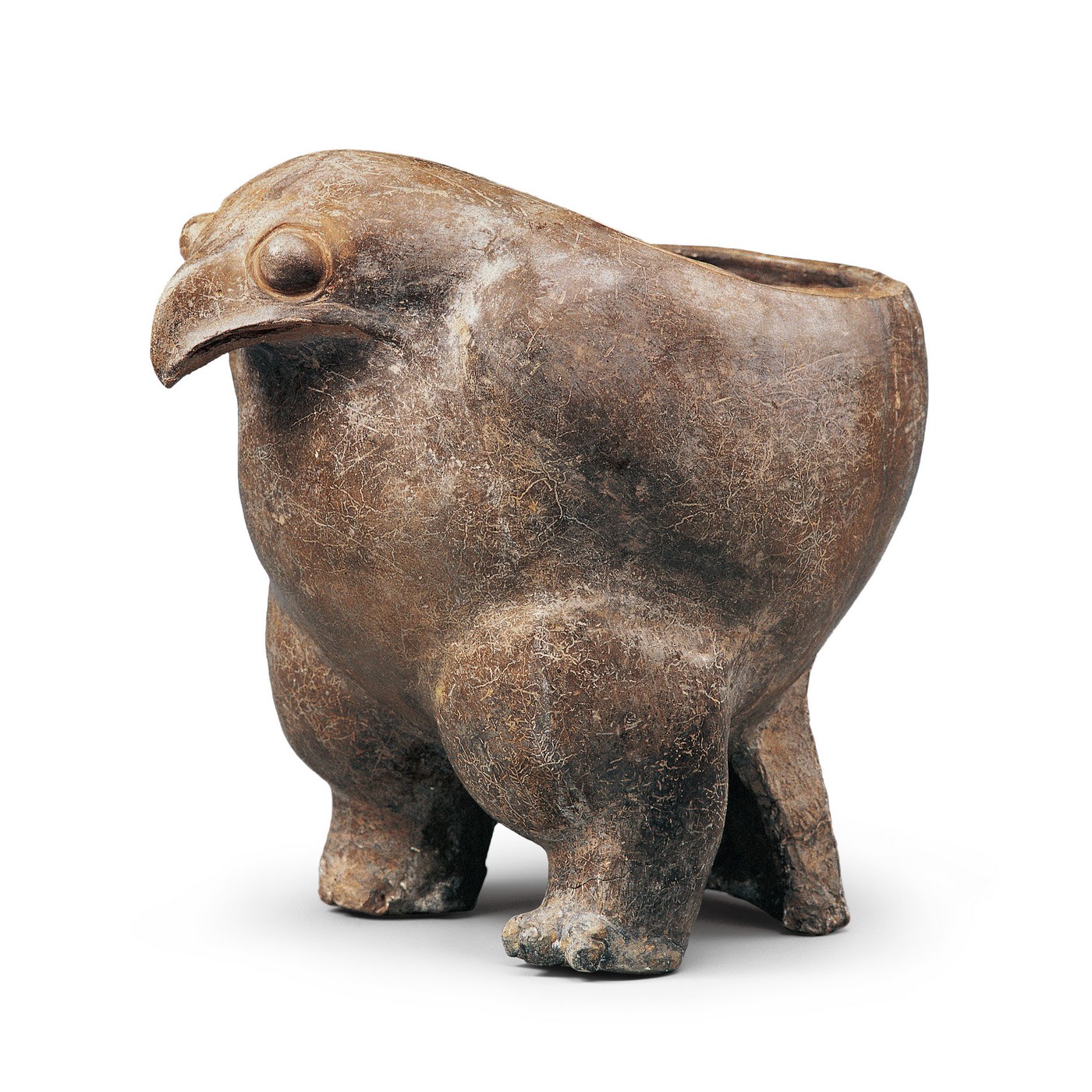 此陶鼎采用伫足站立的雄鹰造型。鹰体健硕,双腿粗壮,两翼贴于身体两侧,尾部下垂至地,与两只鹰腿构成三个稳定的支点。鹰眼圆睁,喙部有力呈钩状,结构简洁,威武雄壮,彰显出一种强大的张力。鼎口设置于背部与两翼之间,紧密结合似背抱状,将鼎形器物特征与鹰的动物美感巧妙地融为一体。