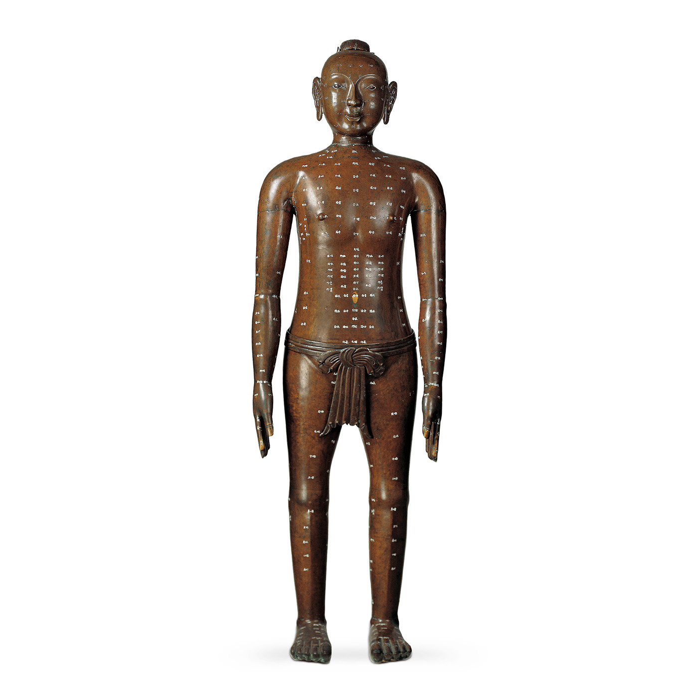 自晋《针灸甲乙经》问世以来,历代针灸学著述因图谱难绘而多数只记灸法不记针法。北宋天圣年间 (公元 1023年-1031年 ),在宋仁宗要求下,太医王惟一考订针灸经络,设计并主持铸造了两件针灸用的铜人模具。铜人与真人大小相似,胸腹腔中空,表面铸有经络走向及穴位位置,穴位钻孔,用于考核学生掌握针刺技术的熟练程度。使用时先在铜人表面涂上一层黄蜡,向铜人体内灌满水,学生用针扎刺穴位,如果扎得准确,水就会由孔中流出,否则无水流出,以此考定成绩。两件铜人一置医官院,一置相国寺。金灭北宋时,相国寺铜人毁于战火,仅剩医官院的铜人,元灭金后将此铜人运至大都。因长期使用磨损,元世祖时曾命尼泊尔工匠予以修复。此件针灸铜人应为清光绪年间仿制的。