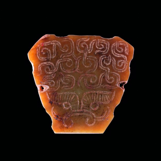 兽面雕刻繁复精美,线条流畅,玉质光润,纹饰精美。玉兽面与1983年河南省光山县宝相寺黄君孟夫妇墓出土的春秋早期玉兽面造型及纹饰基本相同,而该器纹饰更为繁复,青灰色玉质,作倒梯形,头顶有双鸟纹角,左右两边有脊齿,兽面上部雕刻虺纹,下半部刻兽面纹,双眉较粗与鼻相连,刻阴线纹,椭圆形眼紧挨眉、鼻部,下有双框,如意形鼻,脸部刻有虺纹,头两侧及下部有透孔,可系缀。