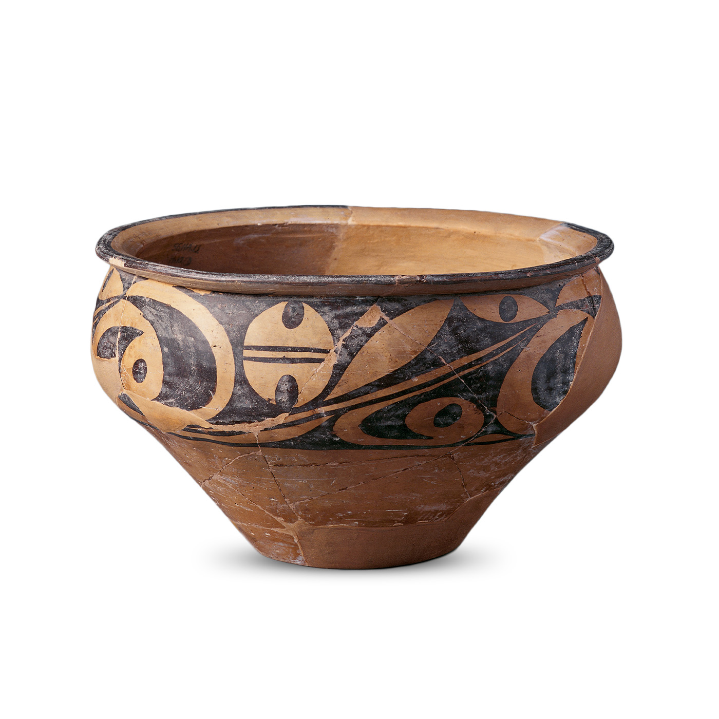 这一地区的仰韶文化中,陶器的90%为红陶,以曲腹碗、曲腹盆、小口尖底瓶、斜沿罐、釜、灶等为代表,纹饰包括绳纹和彩纹。彩纹大部分以圆点、曲线、涡纹、弧线、三角涡纹、方格纹组成,图案富于变化。这是一件有代表性的彩陶。