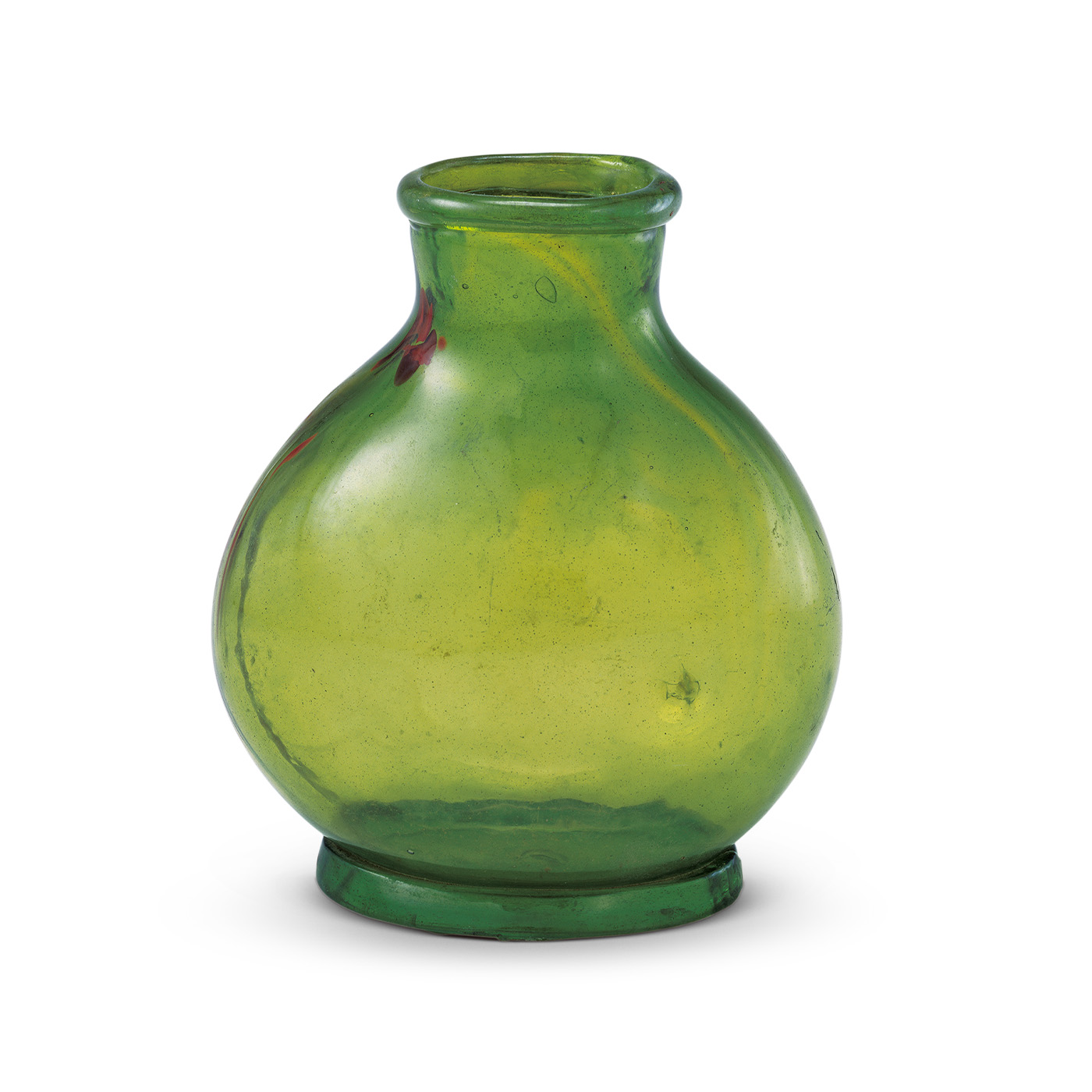 玻璃瓶的瓶口和腹部剖面均为椭圆形,是用吹制法制成的,器壁极薄,晶莹玉润。玻璃条缠圈足和口沿,器底有疤痕。形态为中国传统造型,经化验,其质地为高铅玻璃,是中国自己制造的玻璃器。