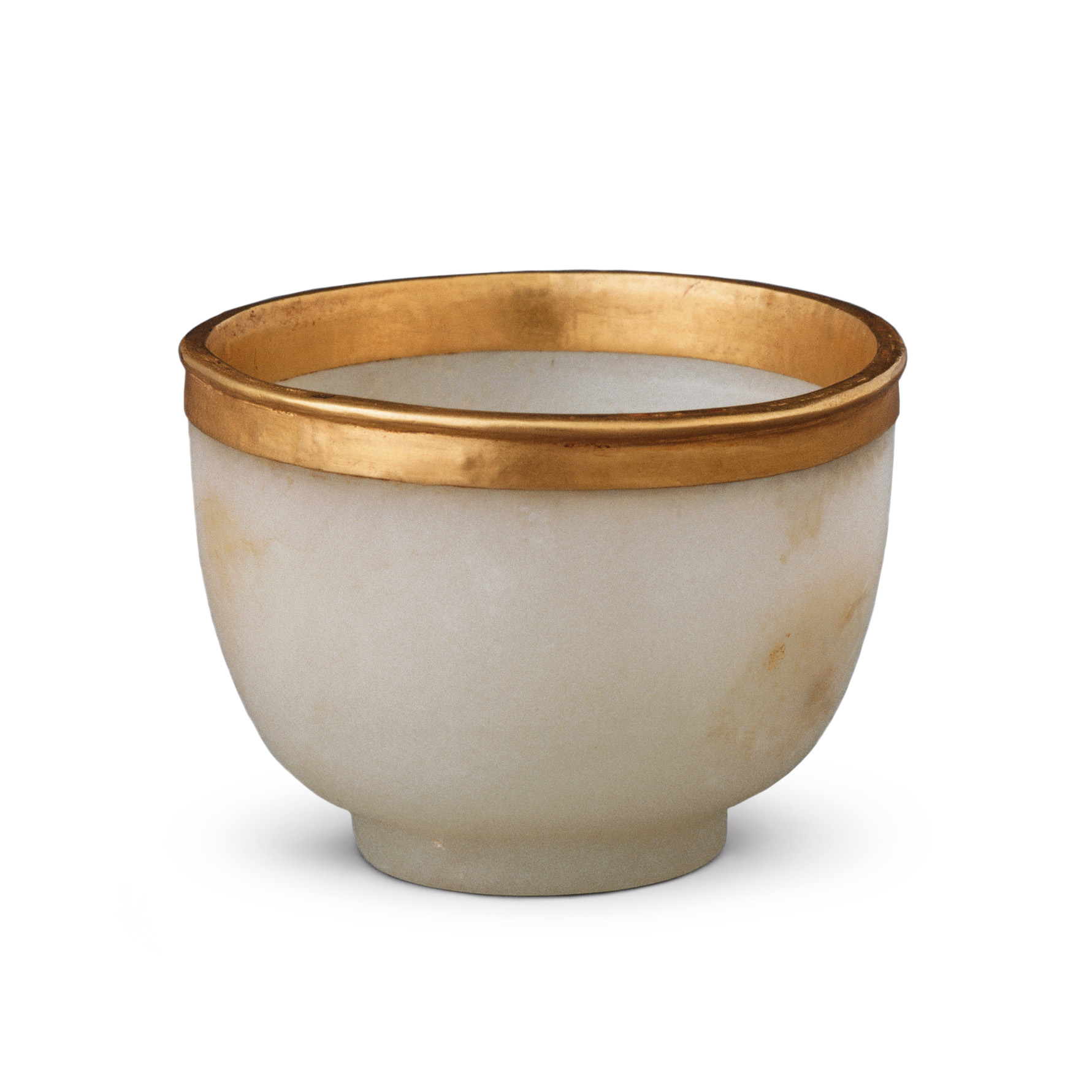 当时这种镶金边的器物很少见,但随着瓷器的发展,碗类由于采用“复烧”,碗口无法施釉,均为芒口,为美化器口的不足,因而有时用贵金属来镶边,后来发展到口沿施釉的也用金属镶边来美化,更收提高价值之效。这件白玉杯镶上金边,不仅显得更加精致、富贵,也包含了“金玉满堂”的寓意。