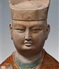 此俑立于束腰台座上,双手执笏拱举胸前。戴冠,冠下有帻。从领间可看出着衣三重,内穿圆领蓝色衣,中着圆领白衣,外穿赭黄色交领宽袖袍,袖口镶绿色边。下身着白裳,长至足面。足穿上翘方头的舄。腰束大带,带尾于腰后折垂至足。前着“蔽膝”。
