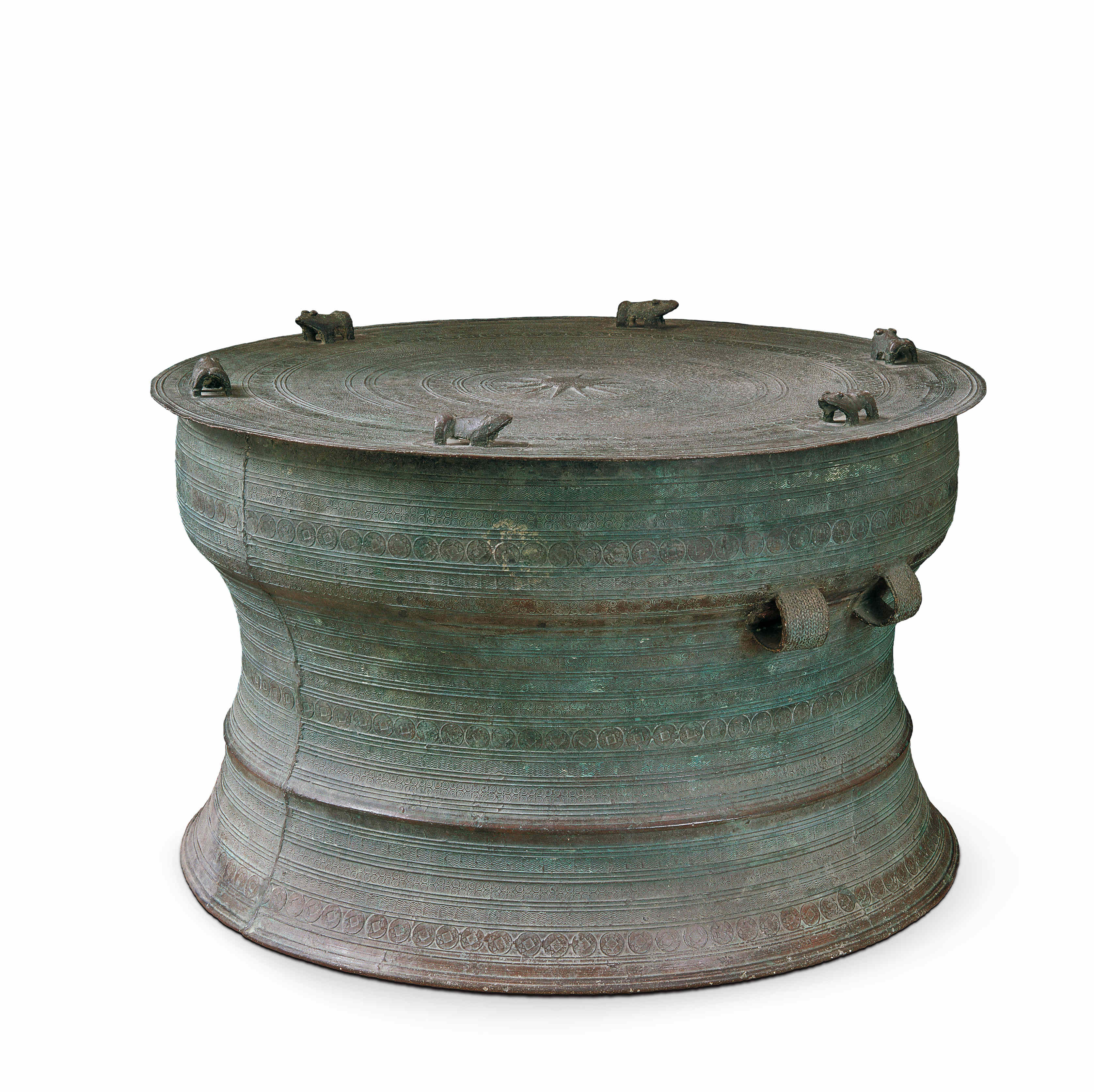 青铜鼓是中国古代南方和西南少数民族象征财富和权力的重器,可作典礼乐器、战争军鼓,也可用于贮存财物和放置尸骨。此青铜鼓鼓面及周身所饰五铢钱纹,系汉代中原地区青铜器上的常见纹饰,表达了人们祈求富贵的美好愿望,说明当时西南各族和汉族在经济交往、文化融合上的密切关系。