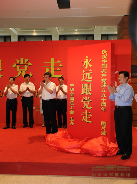 《永远跟党走——庆祝中国共产党成立90周年图片展》6月30日在国家博物馆开幕。中共中央政治局常委、中央书记处书记、国家副主席习近平,中共中央政治局委员、全国人大常委会副委员长、中华全国总工会主席王兆国出席开幕式并参观展览。