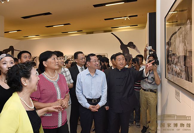 原全国政协副主席张梅颖,文化部部长雒树刚,中国文联党组书记、副主席赵实,中国文联党组成员、副主席左中一,我馆馆长吕章申,中国文联副主席、著名京剧表演艺术家李维康,文化部办公厅主任于群,北京市委宣传部副部长张淼,我馆党委书记、副馆长黄振春,著名表演艺术家于蓝、王晓棠、祝希娟、谢芳、蓝天野、王铁成,著名歌唱家李光羲、郭兰英、胡松华,著名舞蹈艺术家陈爱莲,著名主持人陈铎,著名京剧表演艺术家叶少兰,著名舞蹈理论家和评论家冯双白,北京工美集团有限责任公司党委书记、董事长李节,中国社会经济文化交流协会名誉会长、著名舞蹈表演艺术家赵青等出席开幕式。陈铎先生朗诵诗歌“丹青之爱”,吕章申馆长、赵实书记、李节董事长、赵青女士先后讲话。唐国强、周涛主持开幕式。