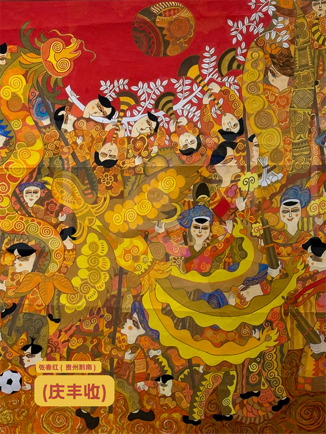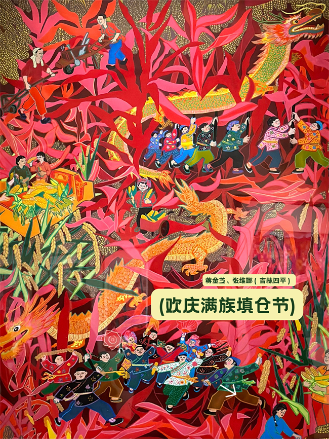 步入展厅,浓郁的色彩扑面而来。那是阳光下麦浪涌动的金黄,是枝头果实熟透的绯红,是各族儿女载歌载舞时衣裙的斑斓。农民画以其特有的色彩语言,将丰收的饱满与喜悦,渲染得如此真挚而炽烈。