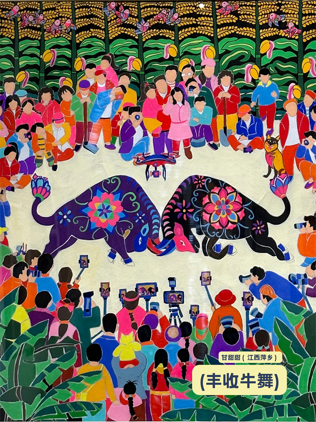 画作不仅定格了历史传承的农耕记忆,也生动勾勒出新时代的乡村图景。直播带货等当代元素与传统丰收场景自然交融,展现出中国农村在时代变迁中焕发的崭新活力。