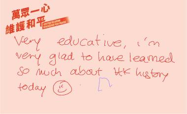 据香港历史博物馆统计,截至11月14日,参观人数已超10万人。观众既有结伴而来的市民游客,也有学校或企业组织的参观团体,在展览的电子留言板里,收录着观众对展览的赞誉、对历史的心痛、对先烈的缅怀、对祖国的祝福和对和平的希望。
