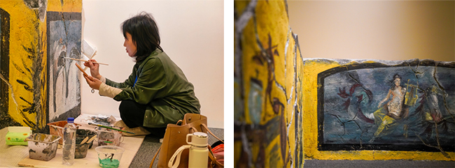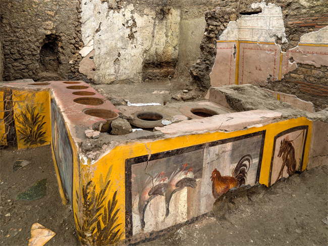 虽然无法真正将古城“搬进展厅”,展览中通过一些场景还原,尽量将彼时的社会图景加以呈现:步入序厅,夕阳下的庞贝大街映入眼帘;第一单元中的浮雕挂饰、小雕像等被置于一个象征花园的场景;第二单元还原了庞贝五区热食店吧台的样貌,吧台上的绘画有标注售卖的鸡鸭等食物,直观展现了当时的市井生活。