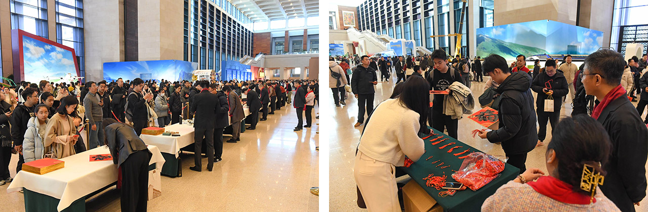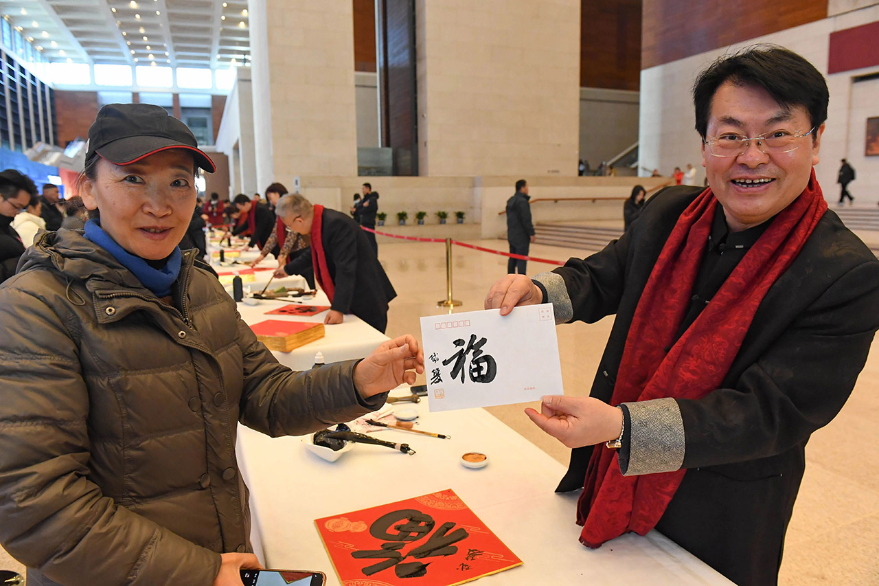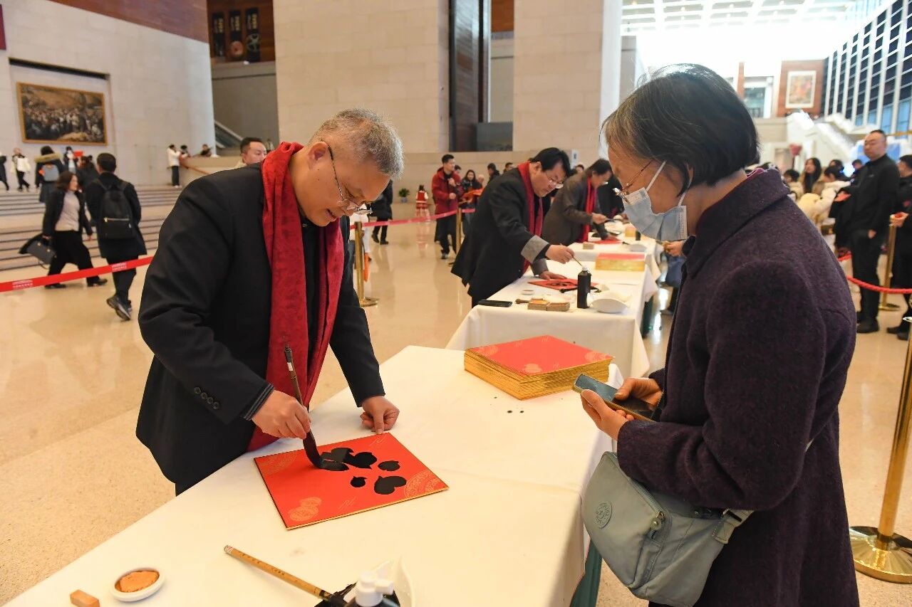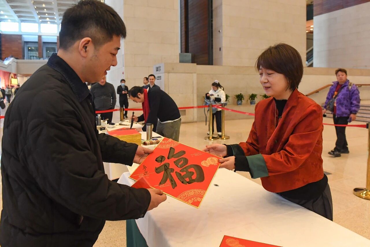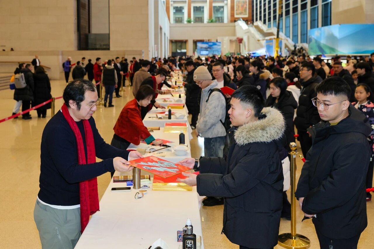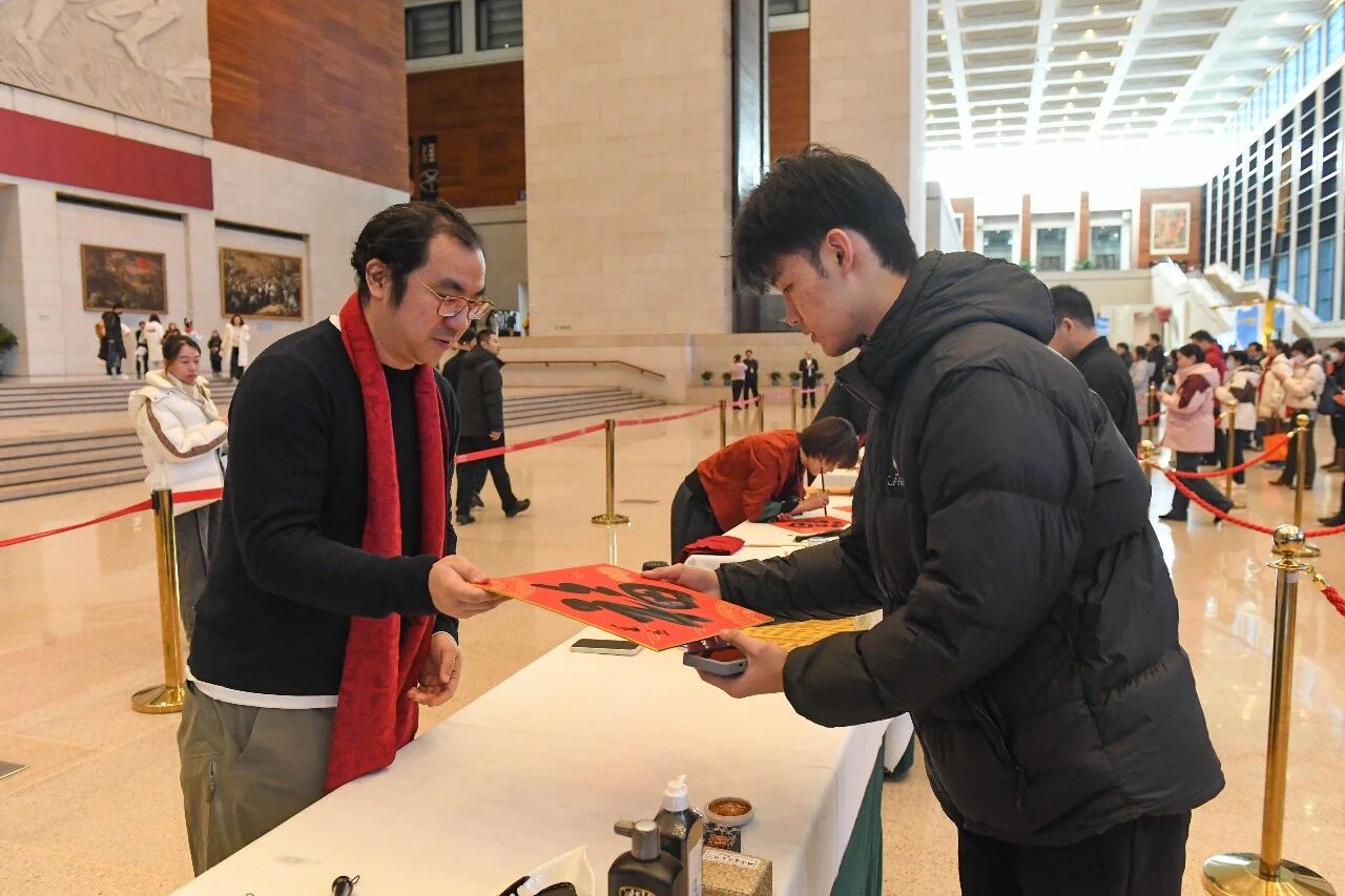 作为国博延续多年的春节特色文化活动,写福送福早已成为“博物馆里过大年”系列的经典环节,今年已是连续第八年举办该活动。活动现场,杨军、晁岱双、赵建军、高秀清、王高升、孟岩、谭斐、夏天薇、康梦洁和范立十位书画家现场执笔,篆隶楷行各展风采,一个个福字跃然纸上。承载着美好祈愿的福卡不仅是刻入年味记忆的经典符号,更藏着大家对新年顺遂、阖家安康的满心期许。艺术长廊内大红福字盈满厅堂,四处洋溢着新春的喜庆氛围,成为丙午新春里一道别样的文化风景线。