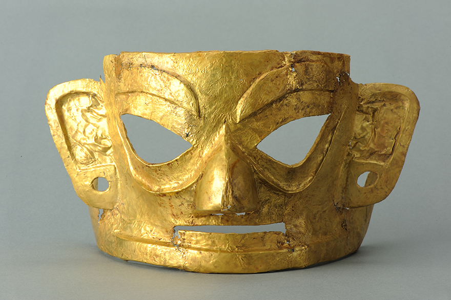 金面具于2007年出土于四川成都金沙遗址祭祀区,为成都金沙遗址博物馆馆藏珍贵文物。其整体在模具上锤鍱成形,眼、鼻、嘴、耳则采用剪切而成。表面打磨光亮,里面未经打磨,较为粗糙,推测原为粘接于青铜人头像或木质人头像之上。这件金面具是目前中国保存最完整的商周时期金面具。
